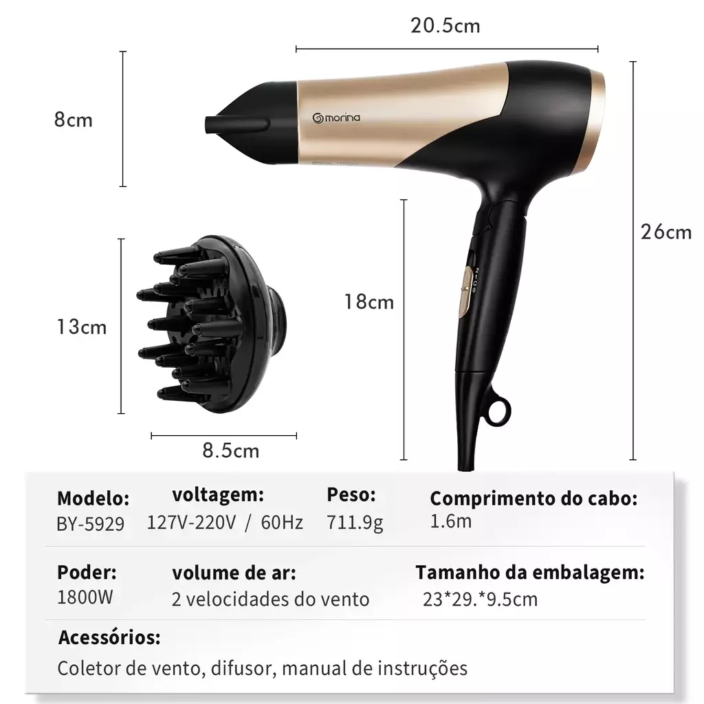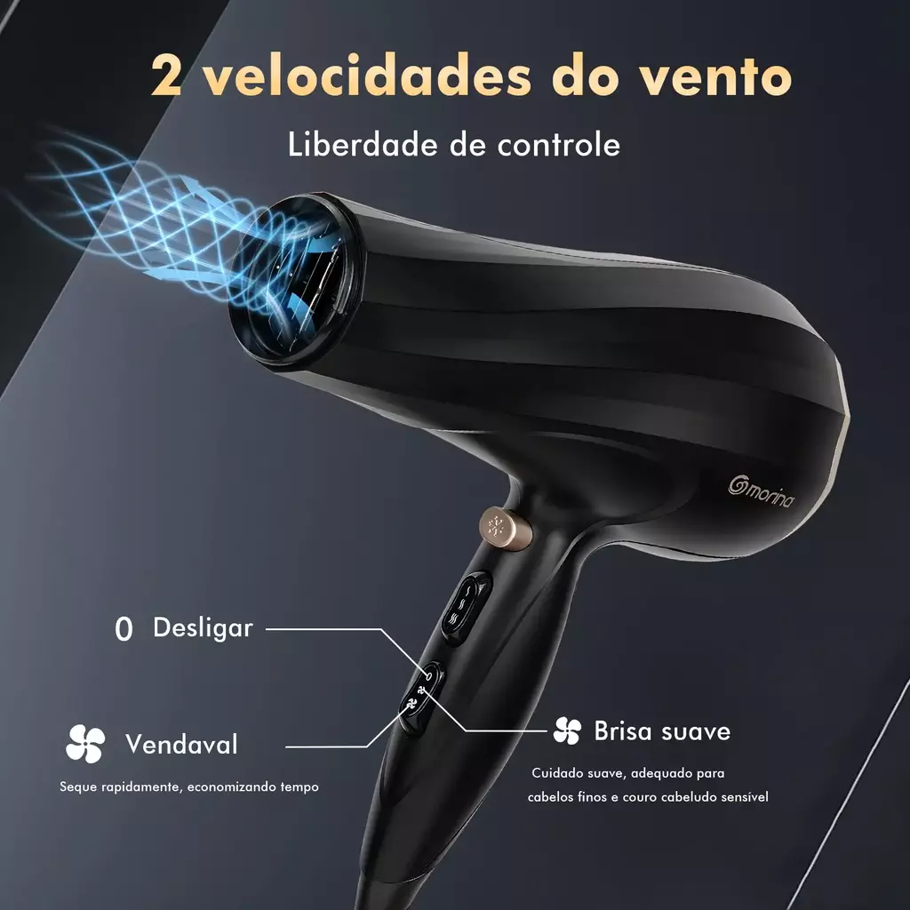 O Secador de Cabelo Profissional Morina combina design elegante e tecnologia de alta performance para oferecer resultados impecáveis em menos tempo. Desenvolvido para uso profissional e doméstico, ele proporciona secagem rápida, brilho intenso e maciez aos fios, preservando a saúde capilar.